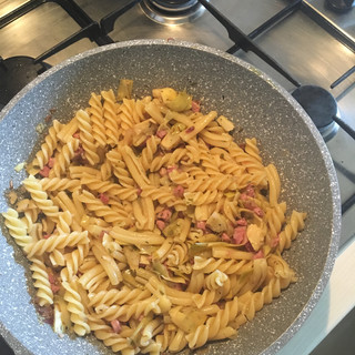 "Pasta con carciofini e pancetta". Mакароны с артишоками и беконом.