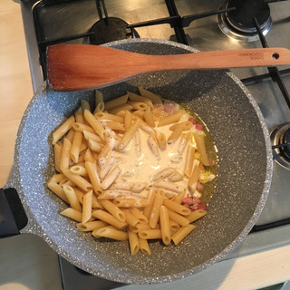 Я написала "по-моему рецепту", потому что то, как делаю ее я и как ее делают в ресторанах России, очень отличается от оригинального рецепта. В оригинале для того, чтобы на макаронах образовался легкий "крем" используют 3-4 сырых желтка, которые перемешивают с макаронами, беконом и сыром в сковородке уже на выключенном огне. В нетрадиционном рецепте часто используют сливки для придания эффекта "крема". Вот и в своем рецепте я буду использовать сливки.